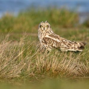 In den angrenzenden Poldern halten wir Ausschau nach Sumpfohreulen. Während sie im Winter regelmässig in der Region vorkommen, sind im Frühjahr nur wenige Individuen anwesend – einige Paare brüten jedoch sogar hier. Brachpieper, Schafstelze, Zistensänger und Rohrammer sind häufigere Arten.