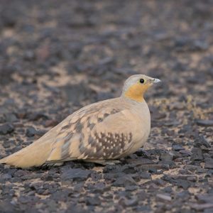 Sandflughühner können wir möglicherweise zuerst an ihrem charakteristischen Ruf ausmachen, bevor wir sie sehen. Sie fliegen früh morgens zu ihren Tränken. Adlerbussard und Lannerfalke jagen bereits.